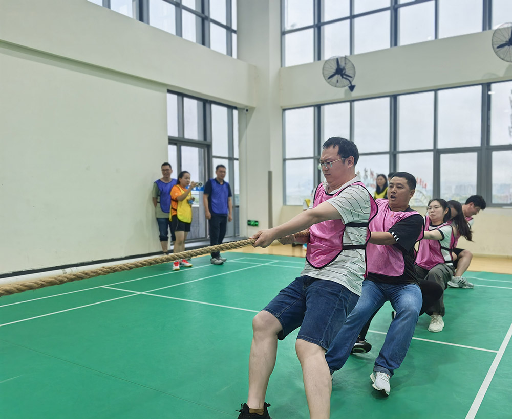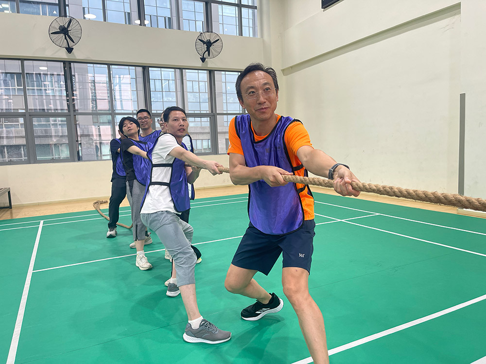下午15时,趣味运动会燃情开赛。五支参赛队伍在羽毛球混双、团队“共进退”和拔河三个项目中展开激烈角逐。羽毛球场上,男女搭档配合默契,尽显协作精神;“共进退”项目中,各组成员步调一致、默契配合,生动诠释了“和合共生”的活动主题;压轴的拔河比赛则将现场气氛推向顶点,队员们心往一处想、劲往一处使,齐声呐喊、齐心协力,将团队凝聚力展现得淋漓尽致。